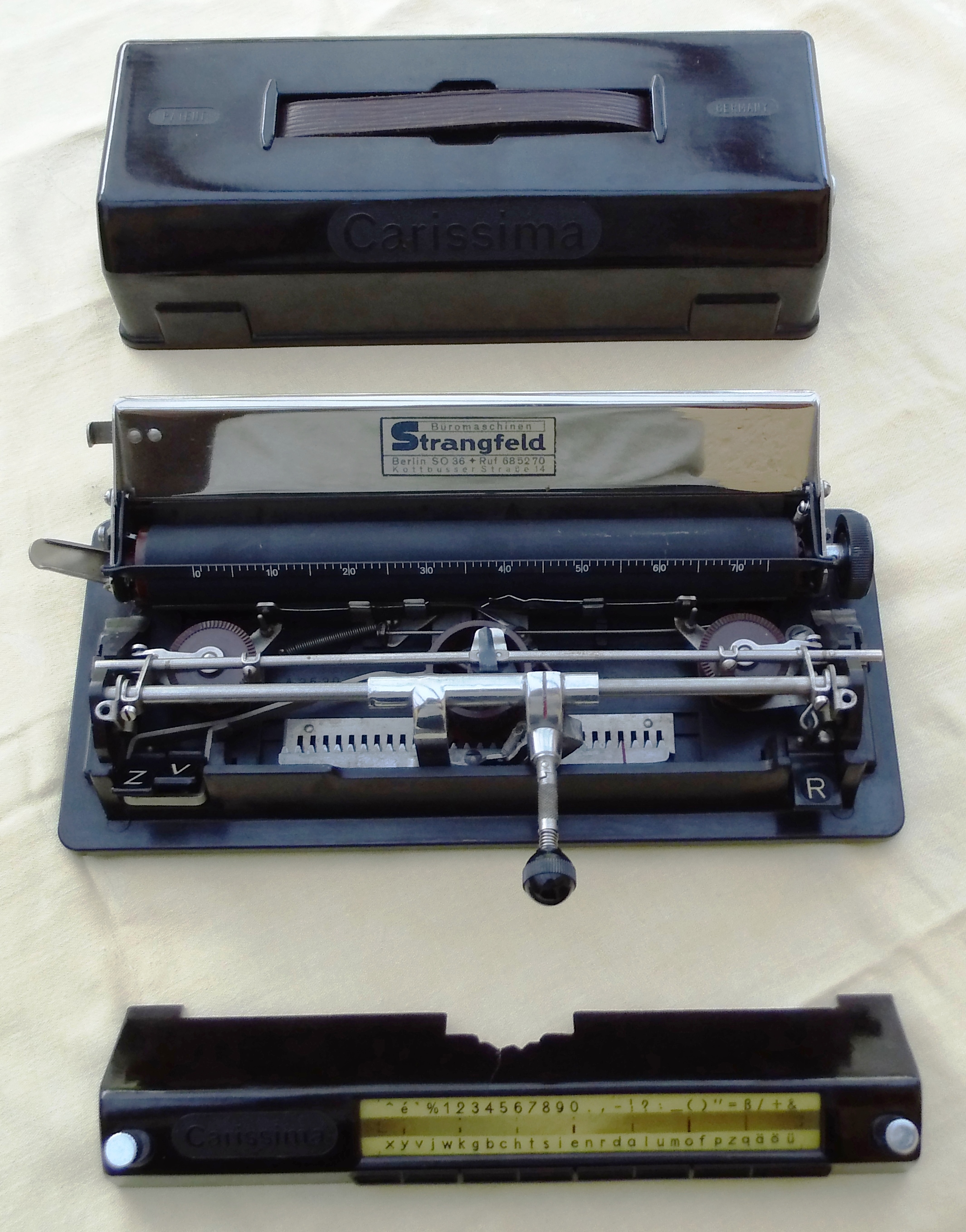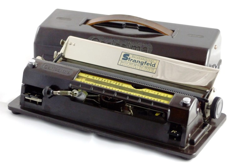 Geschichte: ab 1934 gebaute Miniatur-Zeigerschreibmaschine mit Typenrad sog. Aktentaschenschreibmaschine mit den Maßen: 28,5×12,5×8 cm, Gewicht: 1,8 kg
