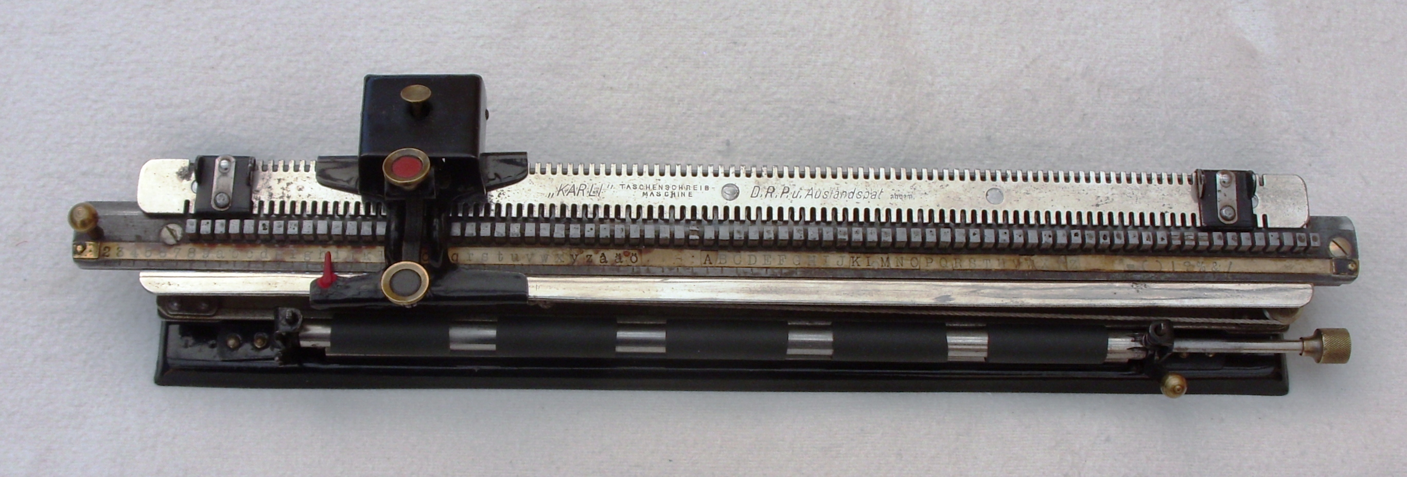 Die „KARLI“ Modell 1 ist eine einreihige Zeigerschreibmaschine mit Typenlineal, auch Miniatur- oder Taschenschreibmaschine genannt. Als erstes Baujahr wird 1927 genannt. Die einzelnen Typen im Typenlineal werden beim Schreiben herunter gedrückt und über ein feststehendes Farbband von oben zum Abdruck gebracht. Die Typenträger sind Einzeltypen und haben 78 Zeichen.