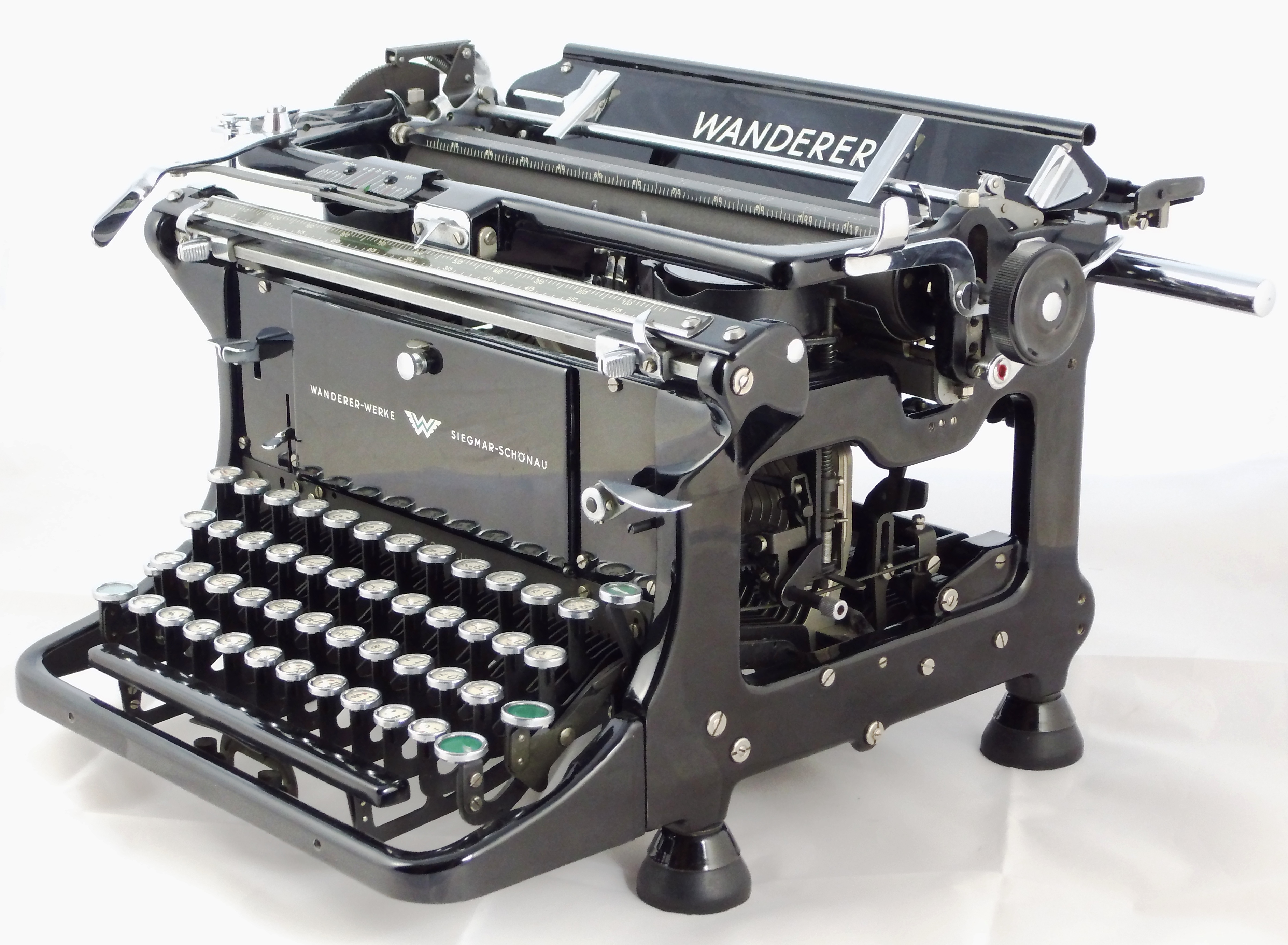 Eine „WANDERER“ Notenschreibmaschine der Wanderer-Werke AG Chemnitz-Schönau aus dem Jahr 1943. Mit ihr können Notenblätter einschließlich der Linierung geschrieben werden. Sie ist die einzige in Sammlerkreisen bekannte derartige Maschine und damit wahrscheinlich die einzig existierende überhaupt. Die Anzahl der hergestellten Maschinen und ihr damaliger Preis sind unbekannt. Wenn man davon ausgeht, dass die hochwertigste „Continental“ SSM, die „Silenta“, der Wanderer-Werke damals 480,– Mark kostete, dann wird diese Maschine, die sicher nur auf Bestellung hergestellt wurde, mindestens das Doppelte gekostet haben.