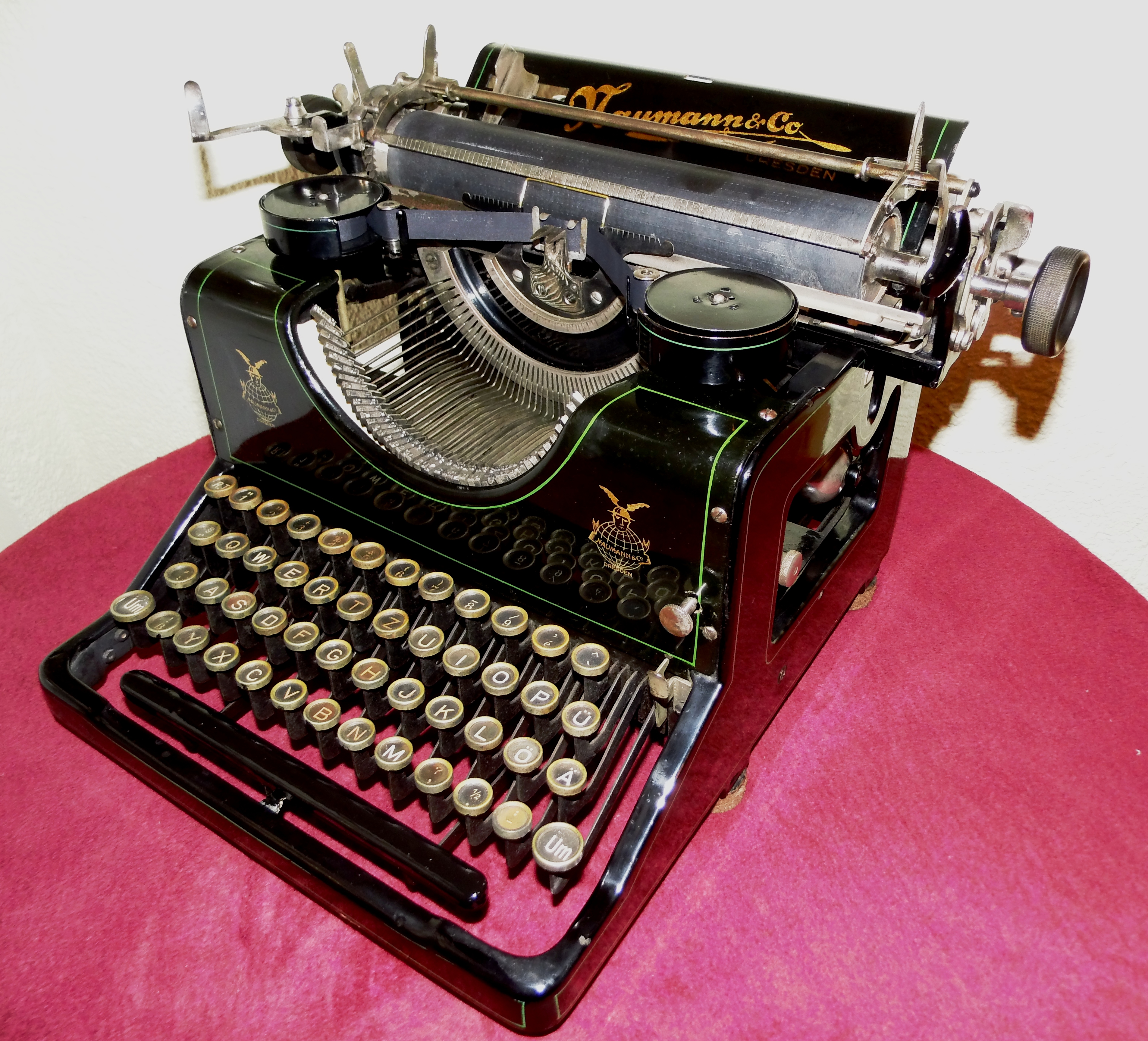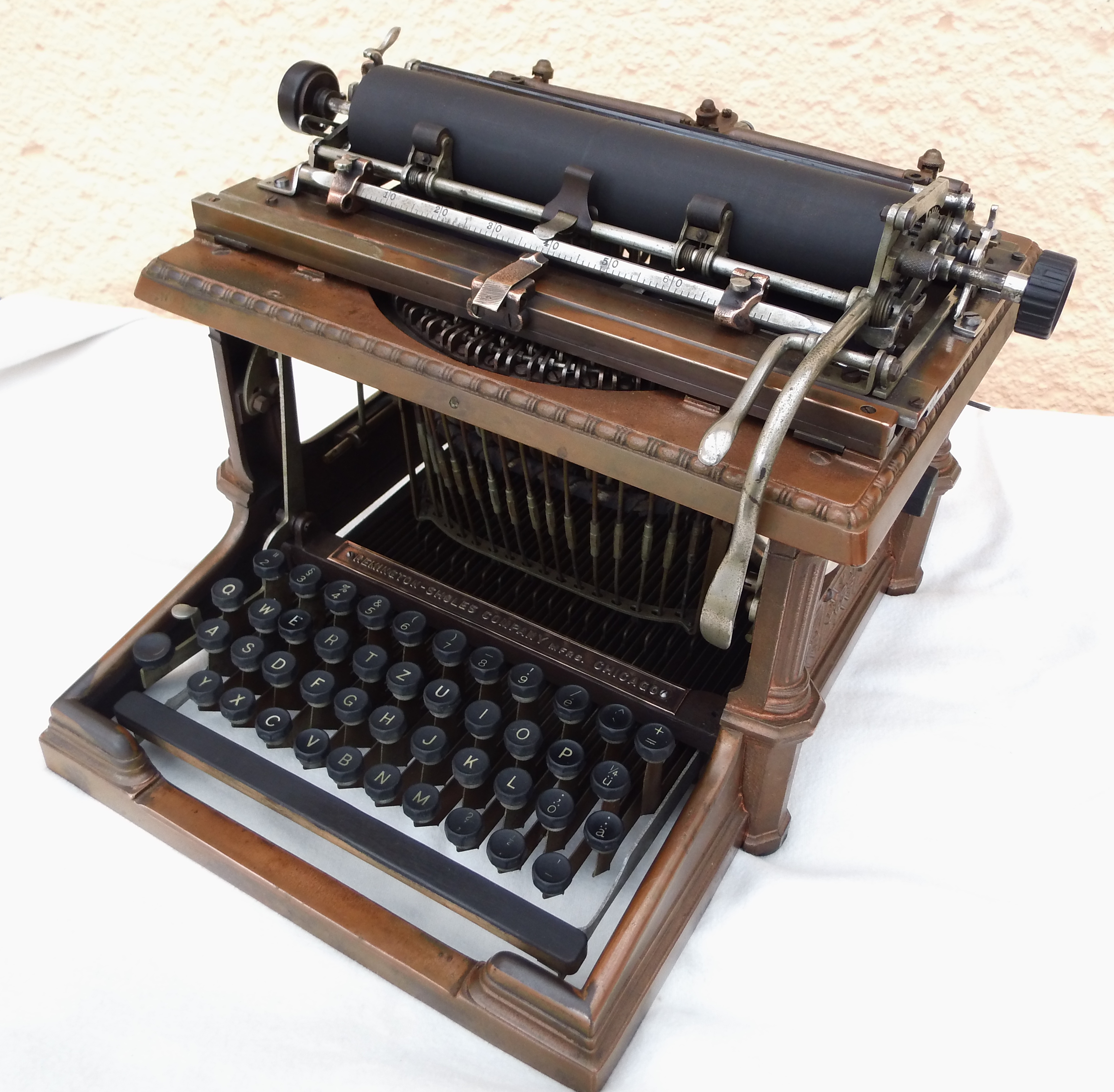 Ein Anruf aus dem Erzgebirge bescherte mir diese seltene amerikanische Schreibmaschine REM-SHO, die von der Firma Remington-Sholes Company ab 1896 in Chicago hergestellt worden ist. Ihr neoklassizistischer Stil, der an griechische Tempel erinnert, wurde von Charles B. Atwood, dem Architekt der Chicagoer Weltausstellung entworfen. Sie ist verkupfert und hat Bauteile aus Kupfer. In Deutschland existieren nur noch 34 solcher Maschinen in Sammlerhand.