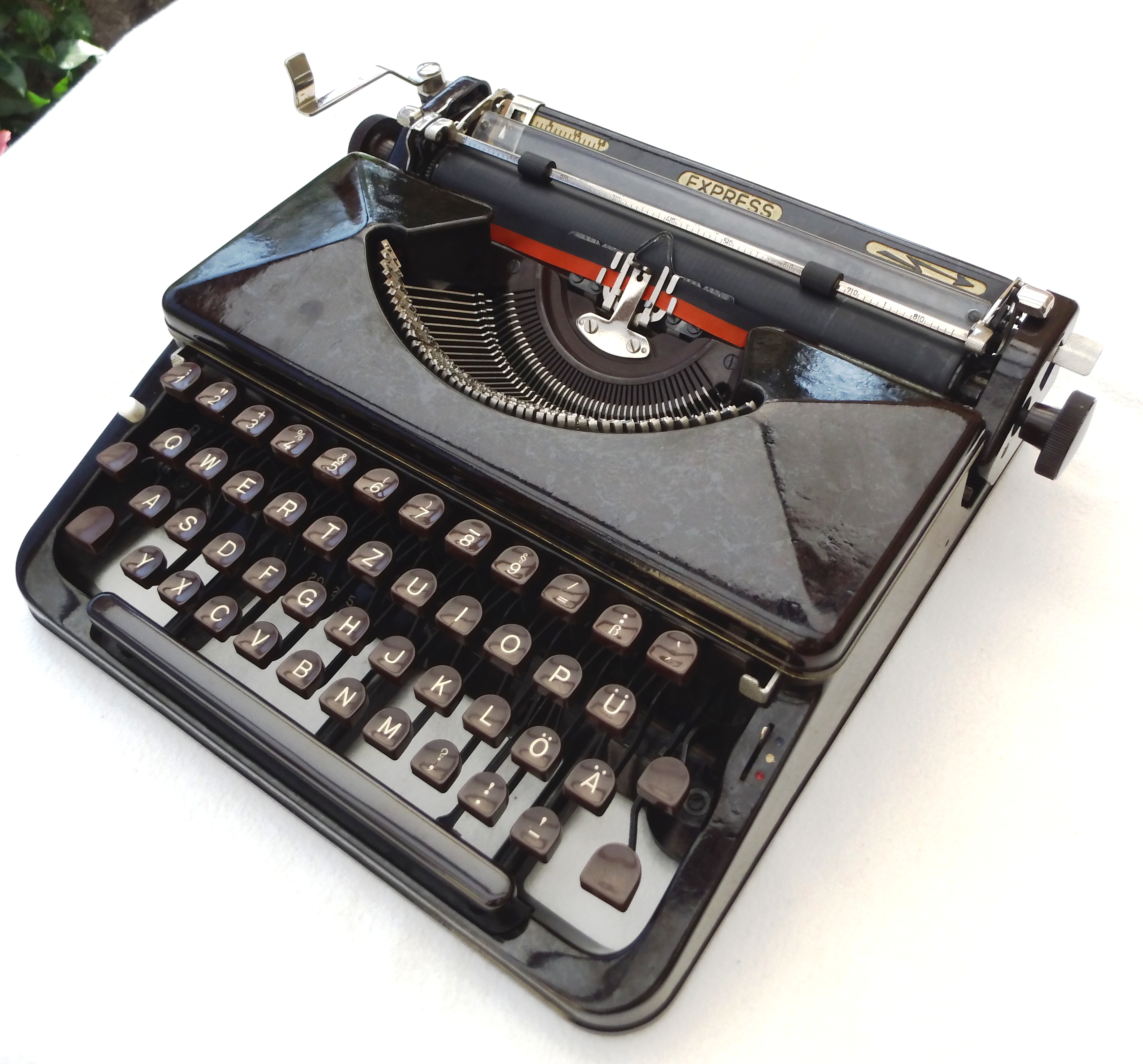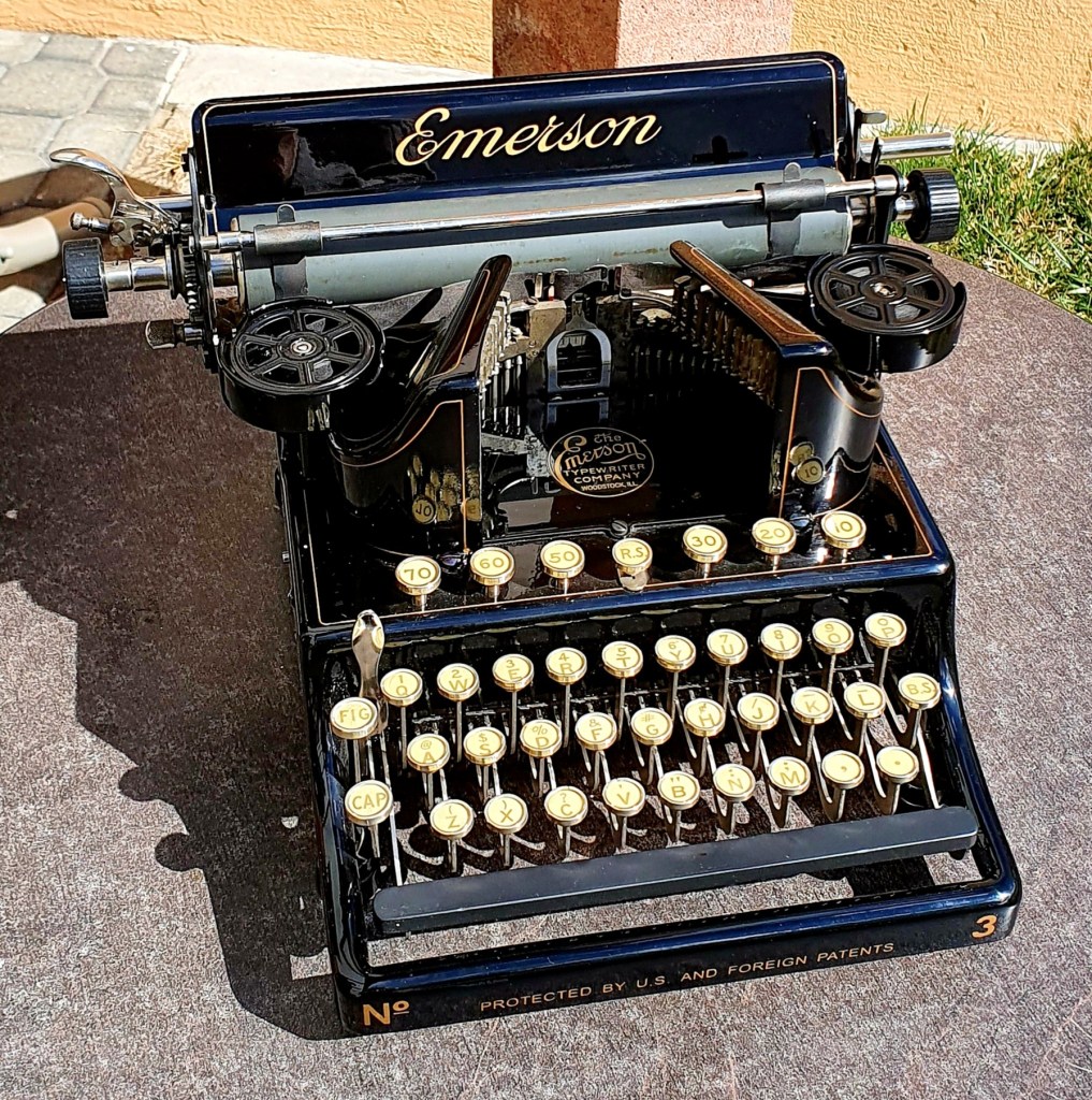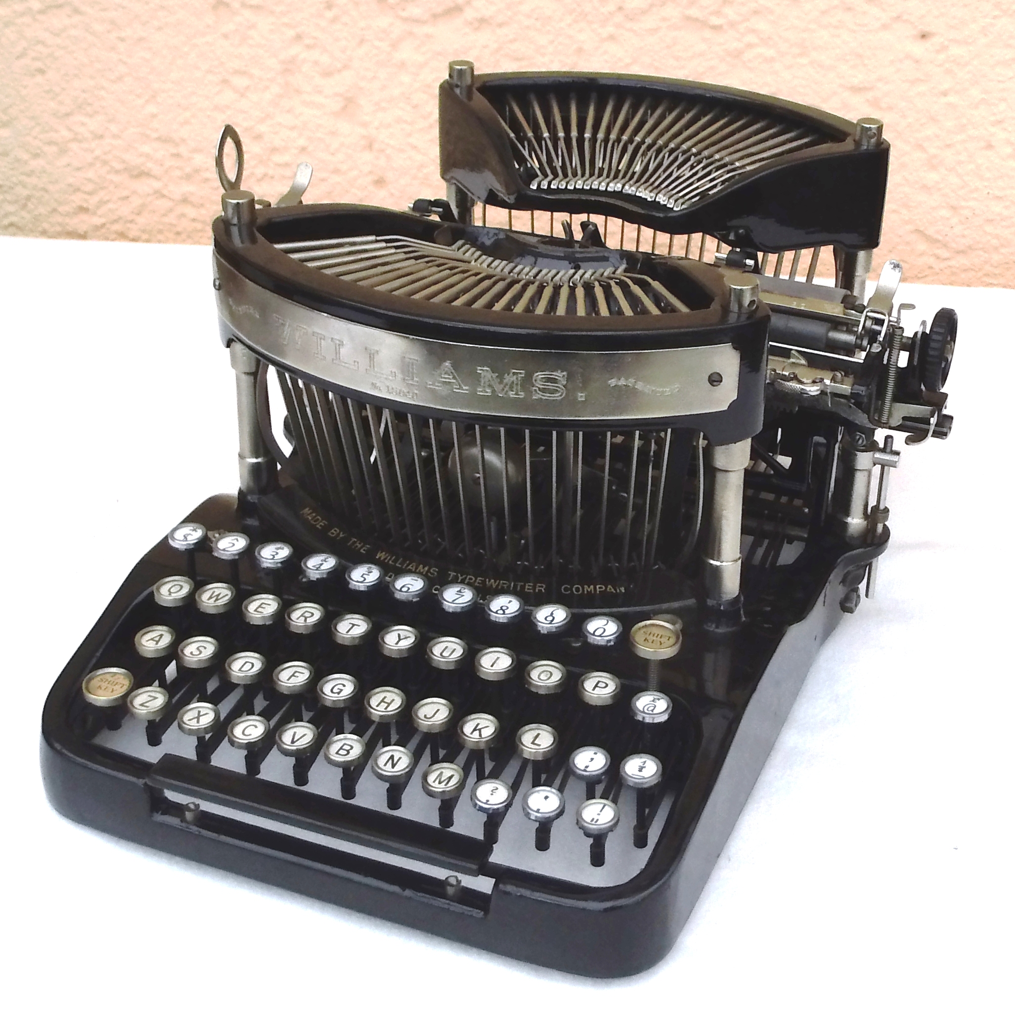 Ein lang gehegter Wunsch ging Erfüllung. Von einen Sammlerkollegen, der seine Sammlung auflöst, konnte ich diese seltene amerikaniche „WILLIAMS“-Schreibmaschine aus dem Jahr 1900 erwerben. Das besondere an ihr ist die eigenartige Typenhebelbewegung. Sie schlagen von vorn und von hinten abwechselnd auf die Walze. Da die Bewegung der von Grashüpfern ähnelt, wird sie auch so genannt.