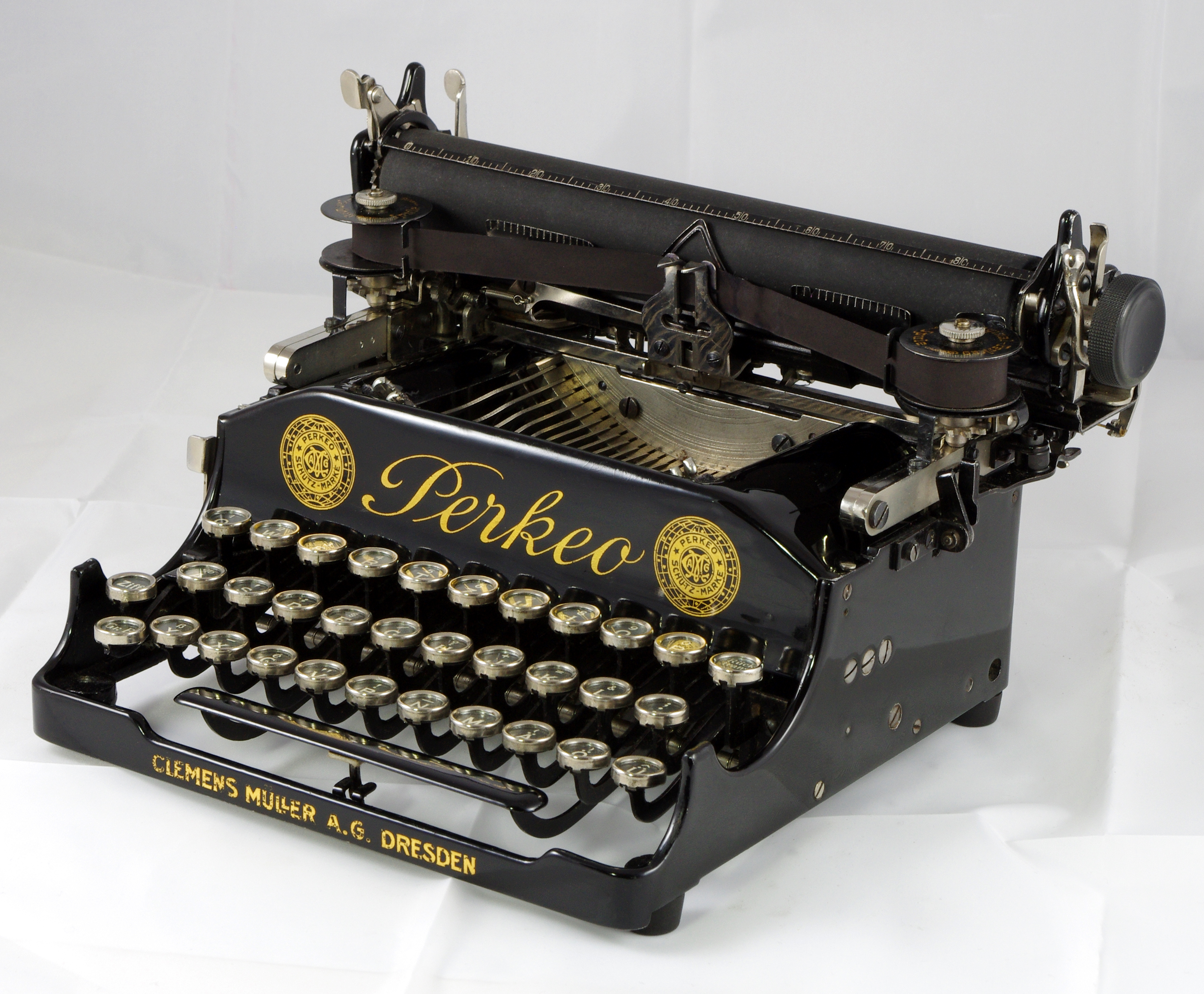 1912 kaufte die Fa. Clemens Müller Dresden die Fabrikationseinrichtungen und weitere Unterlagen auf und brachte die überarbeitete und verbesserte Maschine unter dem Namen „Perkeo“ auf den Markt. Dabei handelte es sich um eine klappbare, dreireihige (doppelte Umschaltung) KSM. Das weiter verbesserte Modell 2 kam 1914 heraus. Die KSM „Urania-Piccola“, die ab 1925 gefertigt wurde, löste die Perkeo ab. Perkeo war der Kunstname eines legendären kleinwüchsischen Menschen, der im 18. Jahrhundert als Hofzwerg und Mundschenk am Heidelberger Hof bekannt war.