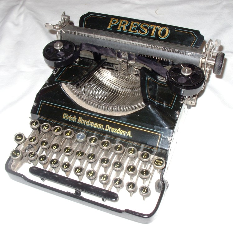 Geschichte: Die seit 1913 bei Frister & Rossmann in Berlin gebaute dreireihige Kleinschreibmaschine „Senta“ (s. Bild) wurde für den Kunden Ulrich Nordmann mit der Aufschrift „Presto“ (lat. schnell) geliefert. Dieser Kunde gründete 1921 zusammen mit einigen Partnern die o.g. Firma und brachte ein eigenes Fabrikat mit der gleichen Bezeichnung heraus. Diese Fabrikat stimmte also mit der „Senta“ konstruktiv überein. 1930 wurde die Schreibmaschinenproduktion eingestellt, da die Firma in Liquidation trat, nachdem ihre Abteilung Nähmaschinenfabrikation unrentabel geworden war. Manchmal wird die „Presto“ mit den Chemnitzer gleichnamigen „Presto-Werken“ in Verbindung gebracht, was aber unzutreffend ist.
