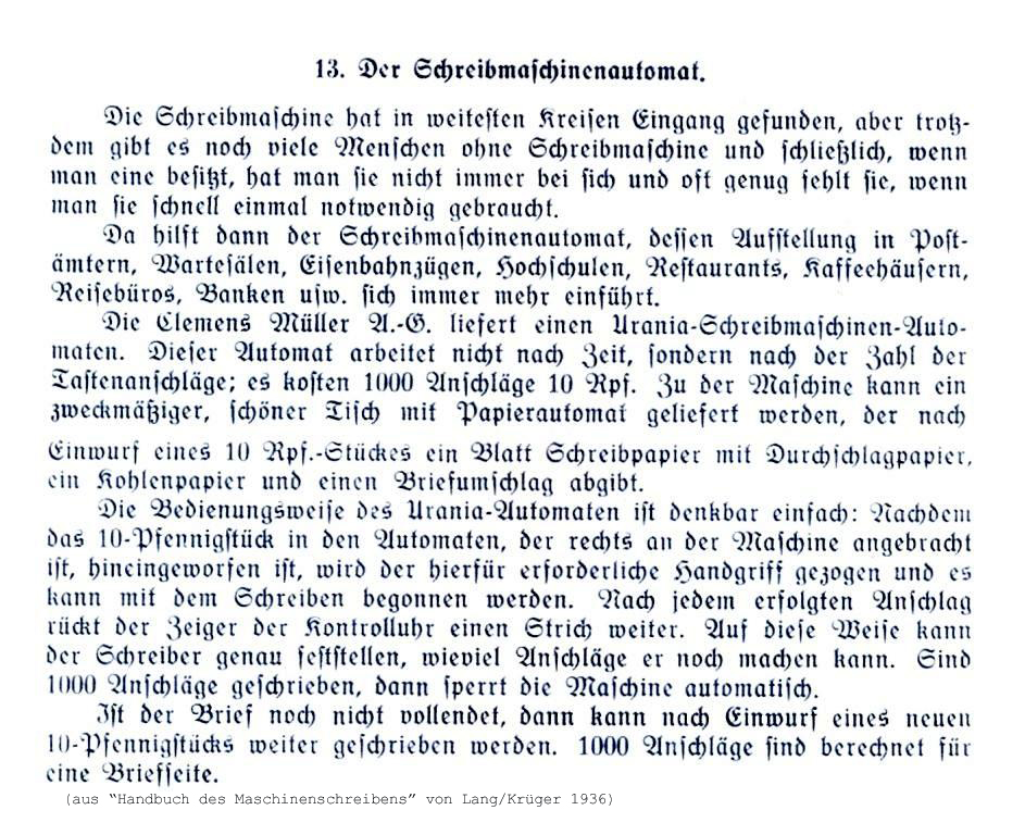 Mit der Einführung der modernen Schreibtechnik Anfang des 20. Jahrhunderts wurden natürlich auch Bedürfnisse geweckt. Ähnlich wie beim Telefon bestand der Wunsch und auch der Bedarf, diese Technik für alle nutzbar zu machen. Nachdem die Münztelefone schon allgemein nutzbar waren, brachte die Firma Clemens Müller als erster Anbieter die „Münzschreibmaschine“, den s.g. Schreibmaschinenautomat heraus.