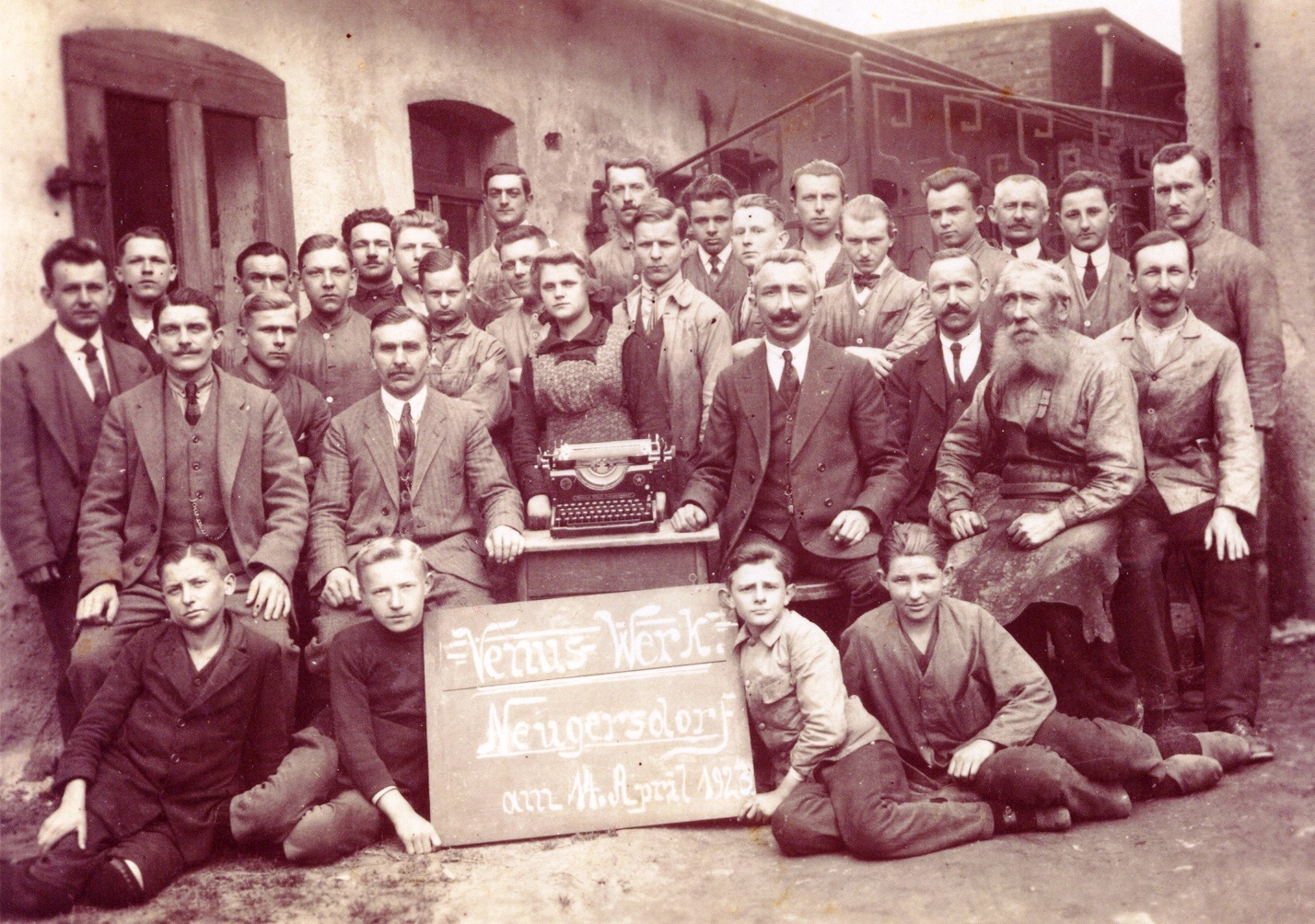 Belegschaft des Venus-Werkes vom 14. April 1923 : in der ersten Reihe auf Stühlen sitzend der zweite von rechts Leberecht Zentsch (mit Vollbart) und vierter von rechts Reinhard Zentsch (neben der Schreibmaschine). Das Foto entstand wahrscheinlich anlässlich der Firmengründung.